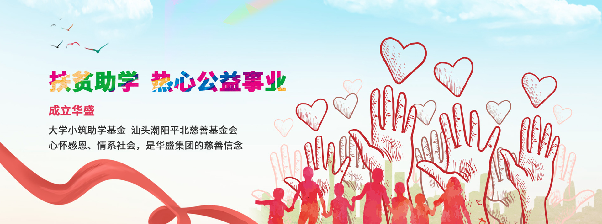 2016年6月,“华盛•大学小筑助学基金”正式成立,首笔启动资金1000 万元,帮助贫困优秀学子圆梦,获得了汕头市人民政府授予的“爱心慈善之星”和“扶贫助学突出贡献奖”。同年,集团向广东省教育基金会捐赠物资,在偏远、贫困地区学校建立图书馆、捐赠图书。